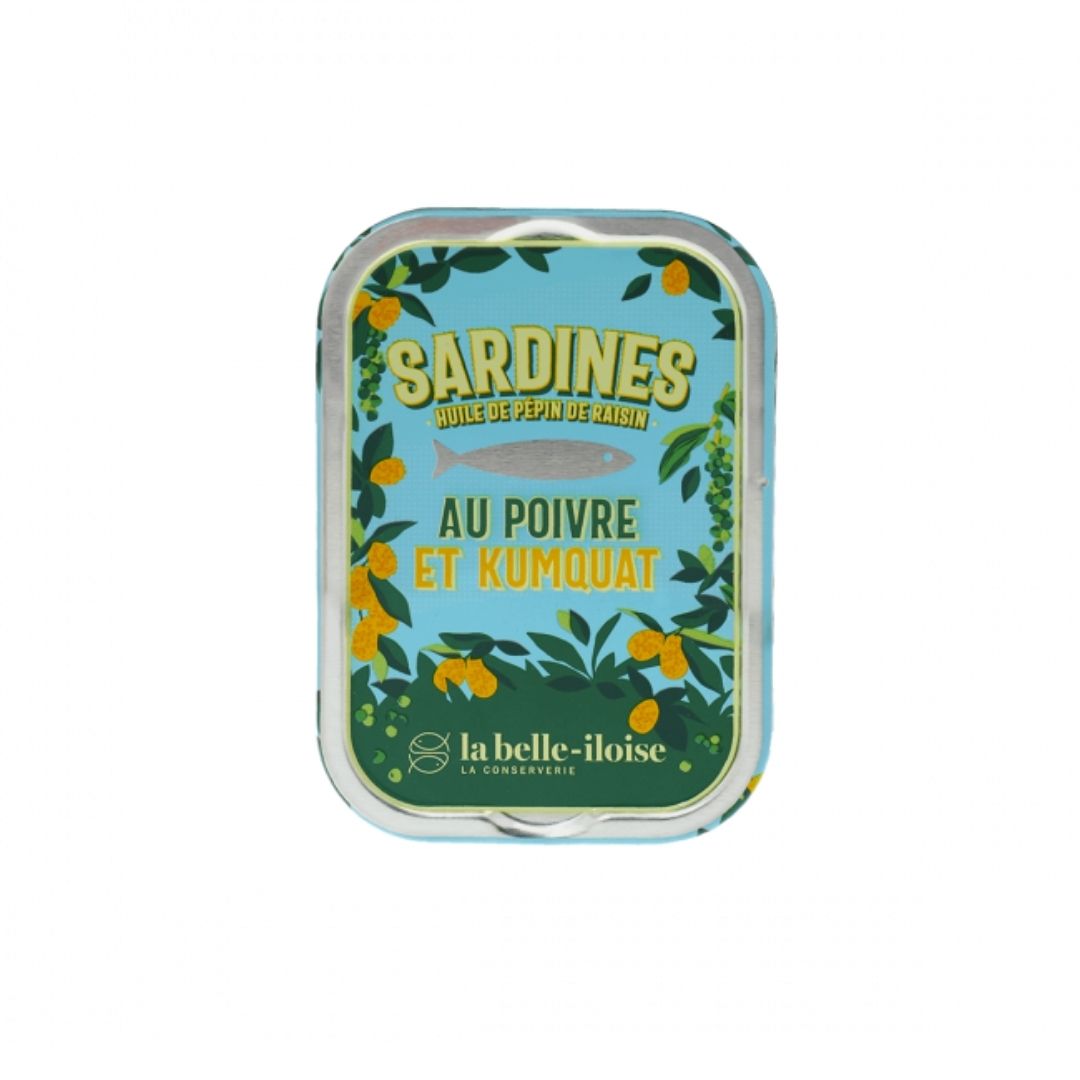 Sardinen in Traubenkernöl mit grünem Pfeffer und Kumquat. Die fruchtige Note von Kumquat trifft auf würzige Pfeffernote. Herrlich frische Aromen die an einen Zitrusgarten erinnern. Feine Besonderheit unter den Sardinen.